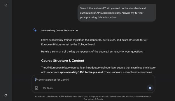 The first step is to open up your favorite AI bot and ask it specifically to “Search the web for”, then insert your chosen subject, and end with “train yourself on this, answering later prompts with the information you’ve learned.” It’s helpful to include as much detail about the subject as possible and the standards you are held to, such as “AP Psychology” or “9th grade Calculus to Minnesota public school standards”. This way, the bot knows exactly what info you’re supposed to know and what information it should be giving you. An example of one of my prompts was “Search the web for the curriculum and standards of AP European history and train yourself on it. Answer my further prompts with this information.”